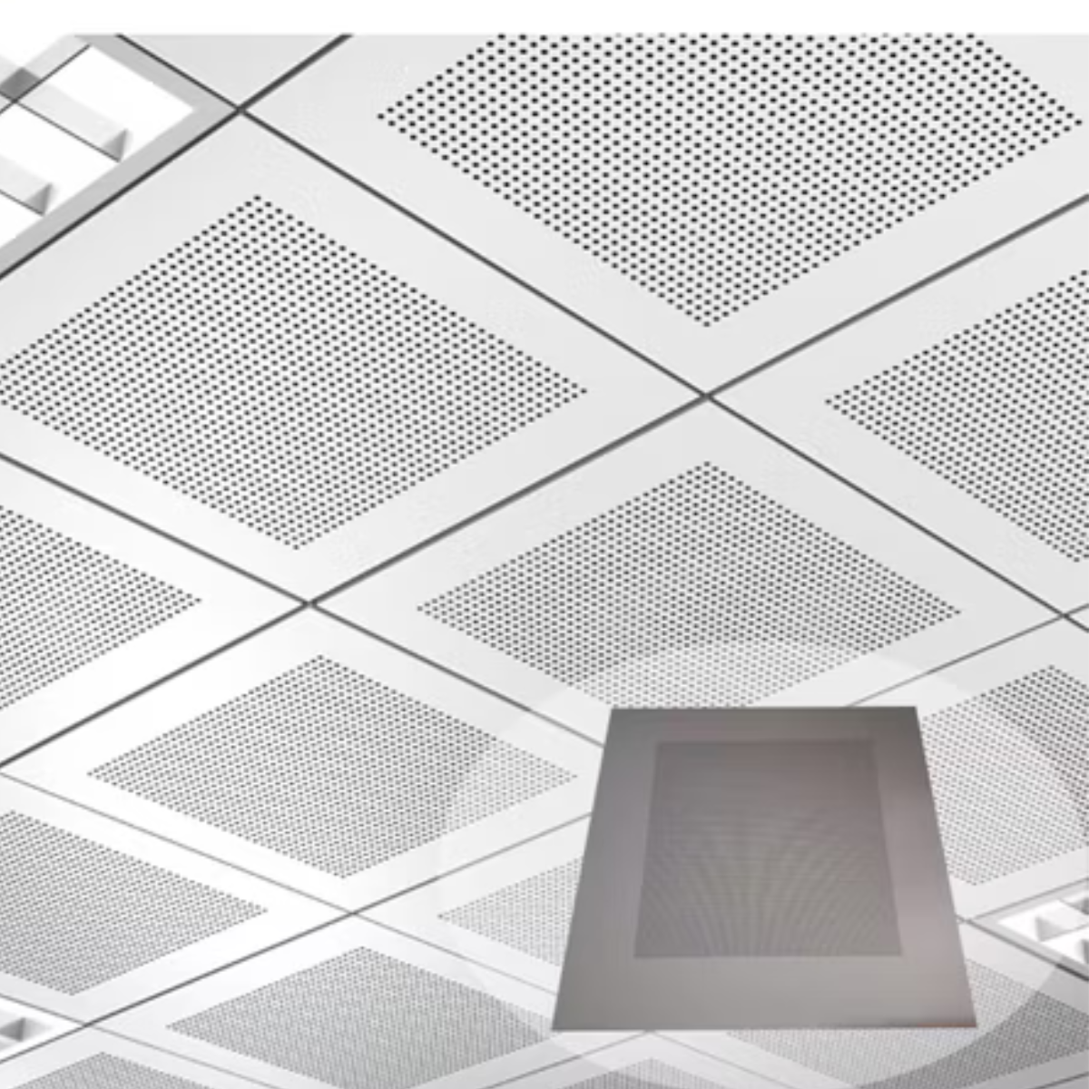 The perforated metal tile is specified with non-woven acoustic Black tissue inside, which can expect good sound absorption. In addition, the Black tissue can be set to reduce air movement and dust penetration through the perforation.
